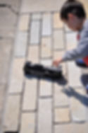 埋込式の車止め。黒煉瓦の網目敷き+コンクリートの洗い出し仕上げ